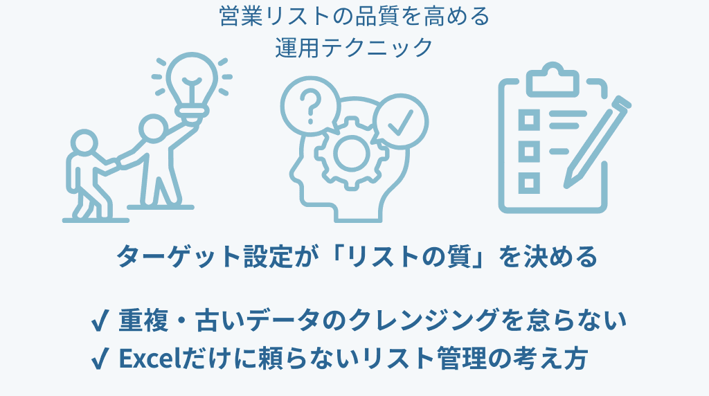良いツールを選んでも、運用の仕方次第でリストの成果は大きく変わります。「大量に集めたのにアポが取れない」という状況に陥らないためには、リスト取得後のターゲット設定やデータクレンジング、管理体制の整備が欠かせません。ここでは、リストの品質を底上げする3つの運用テクニックを紹介します。