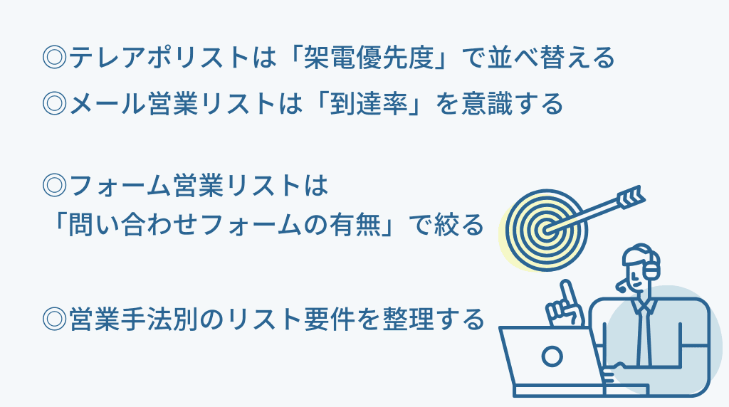 ここまでテレアポ・メール営業・フォーム営業それぞれのリスト運用ポイントを見てきました。共通して言えるのは、営業手法によって「リストに求めるデータ項目」が異なるという点です。この要件を事前に整理しておかないと、せっかくリストを作成しても「使いたいデータが入っていなかった」という事態が起こります。